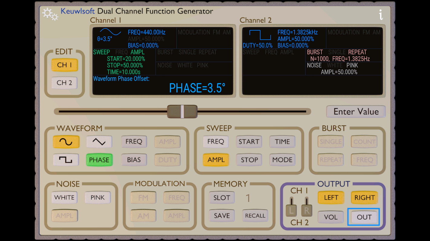 প্রতিটি বাম এবং ডান চ্যানেলের জন্য আউটপুট 16 বিট এবং 44.1kHz এ। আউটপুট আপনার ডিভাইস হার্ডওয়্যার উপর নির্ভর করবে. কিছু ডিভাইস হার্ডওয়্যার ডিসি পক্ষপাত এবং কম ফ্রিকোয়েন্সি সংকেত ফিল্টার করতে পারে। উচ্চ ফ্রিকোয়েন্সিতে, প্রতিটি তরঙ্গরূপের জন্য সীমিত সংখ্যক নমুনার কারণে তরঙ্গরূপ বিকৃত হবে (উদাহরণস্বরূপ 4.41kHz এ, একটি সাইন তরঙ্গরূপ আনুমানিক মাত্র 10 পয়েন্ট হবে)। তাই এটি মজা/শিক্ষামূলক ব্যবহারের জন্য, সমালোচনামূলক অ্যাপ্লিকেশনের জন্য একটি বাস্তব ক্যালিব্রেটেড ফাংশন জেনারেটর ব্যবহার করুন।