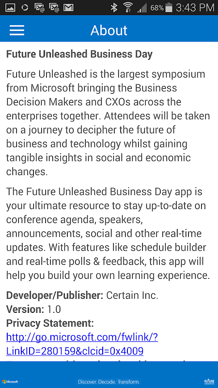 The Future Unleashed Business Day app is your ultimate resource to stay up-to-date on conference agenda, speakers, announcements, social and other real-time updates. With features like schedule builder and real-time polls & feedback, this app will help you build your own learning experience.
