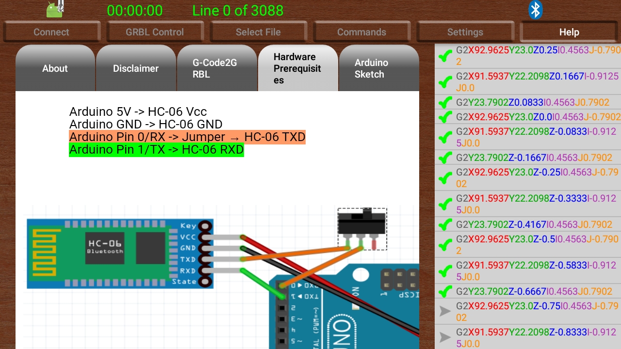 এই অ্যাপ্লিকেশনটির সাহায্যে আপনি আপনার জিআরবিএল সিএনসি মেশিনটি আপনার 10 "ট্যাবলেট থেকে পরিচালনা করতে পারবেন Bluetooth সংযোগটি ব্লুটুথের মাধ্যমে প্রতিষ্ঠিত হয়েছে preferred পছন্দের রিসিভারটি এইচসি -06, যা 6 than এরও কম দামে কেনা যায় Conn সংযোগের নির্দেশাবলী সহায়তা পৃষ্ঠাগুলিতে পাওয়া যায় অ্যাপ।