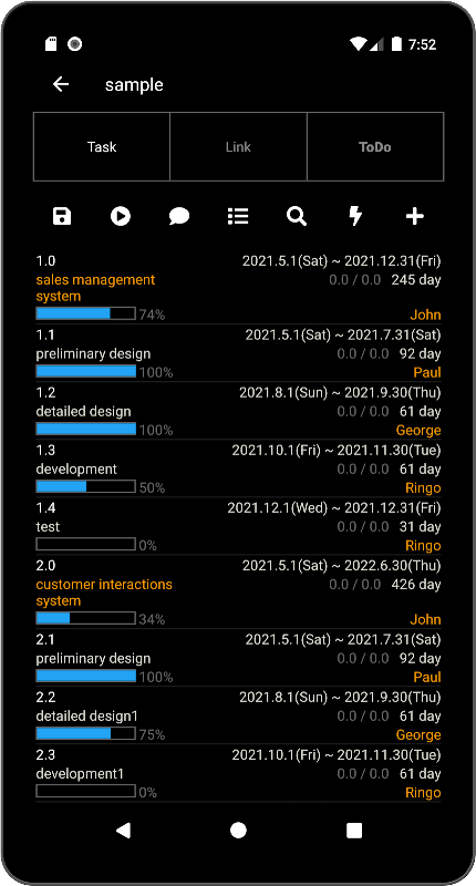 - কাজগুলি তারিখ, অগ্রগতি এবং ব্যক্তি দ্বারা ফিল্টার করা যেতে পারে।