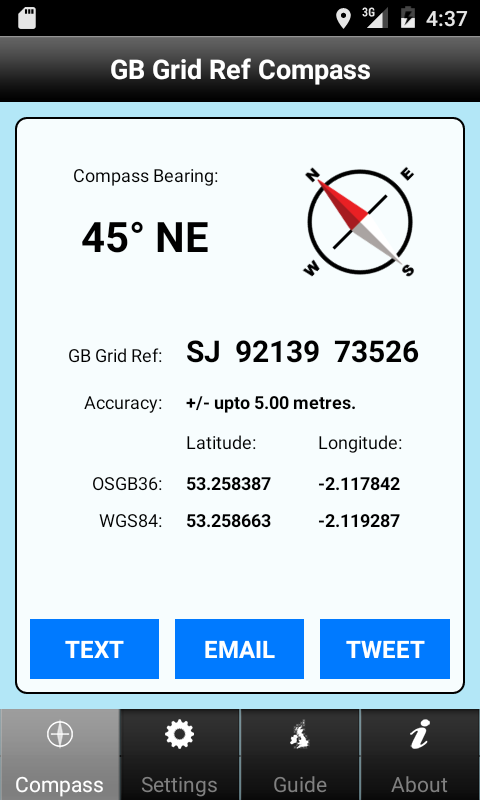 আপনার বর্তমান কম্পাস বিয়ারিং / দিকনির্দেশনা শীর্ষক উভয় OSGB36 এবং WGS84 ফরম্যাটের অক্ষাংশ ও দ্রাঘিমাংশের মান বরাবর দেখানো হবে.