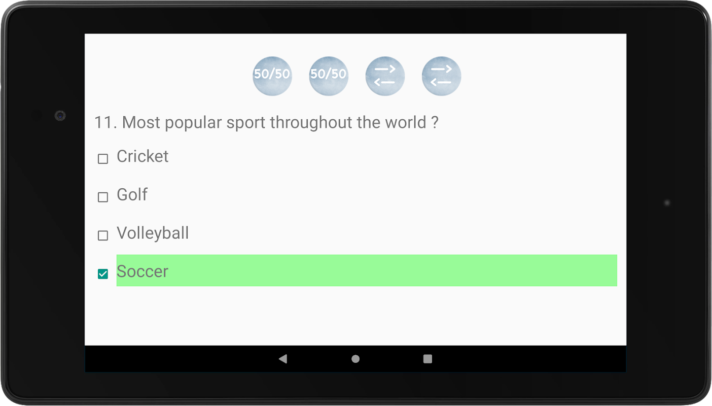 - Quiz to help buttons included (50/50 and swap ) , If you are not sure about the answer you can go for help max four helps