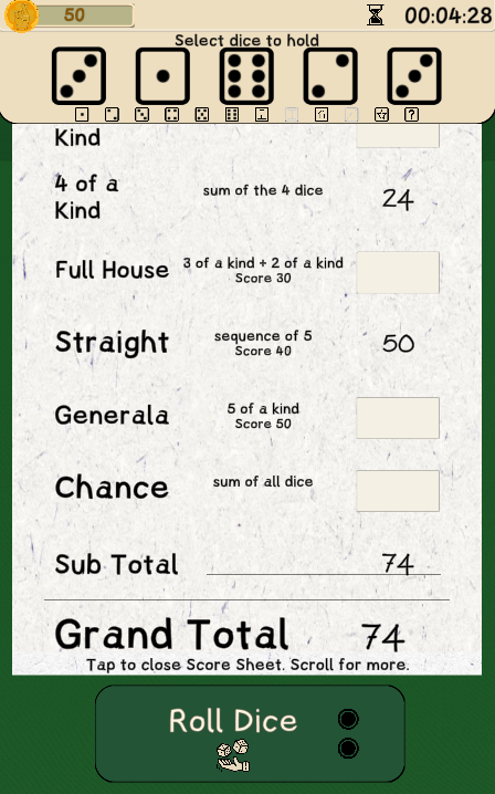 একজন খেলোয়াড় একই সংখ্যা দেখানো পাশার যেকোনো সংমিশ্রণে সংখ্যা যোগ করতে পারে। যদি এই সবগুলি 65 পয়েন্ট বা তার বেশি যোগ করে, 35 এর একটি বোনাস দেওয়া হয়।
