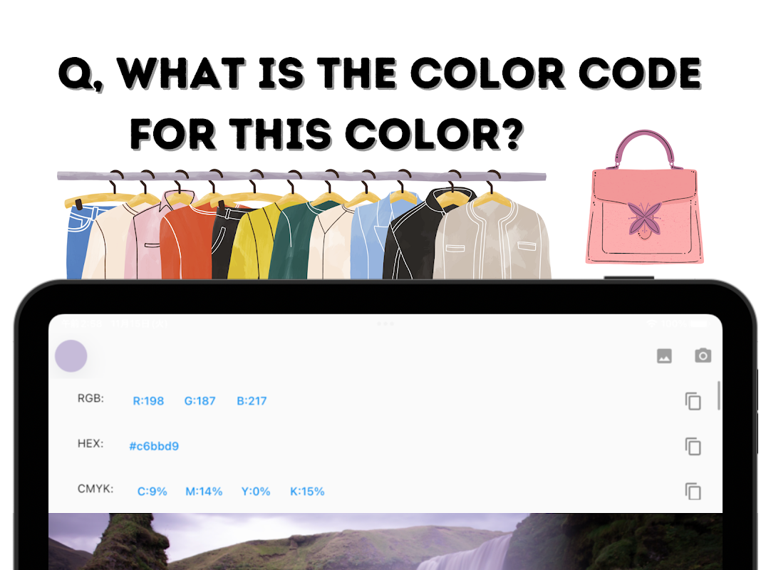 Easily find the color code/color space from an image! RGB,HEX,CMYK,HSV,Lab,etc.