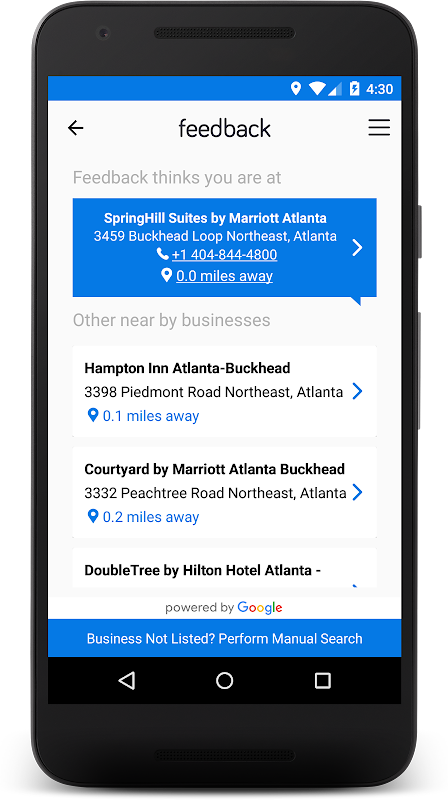 Feedback suggests businesses based on your geolocation and allows you to send a message that will be delivered in real time to the owner or manager.