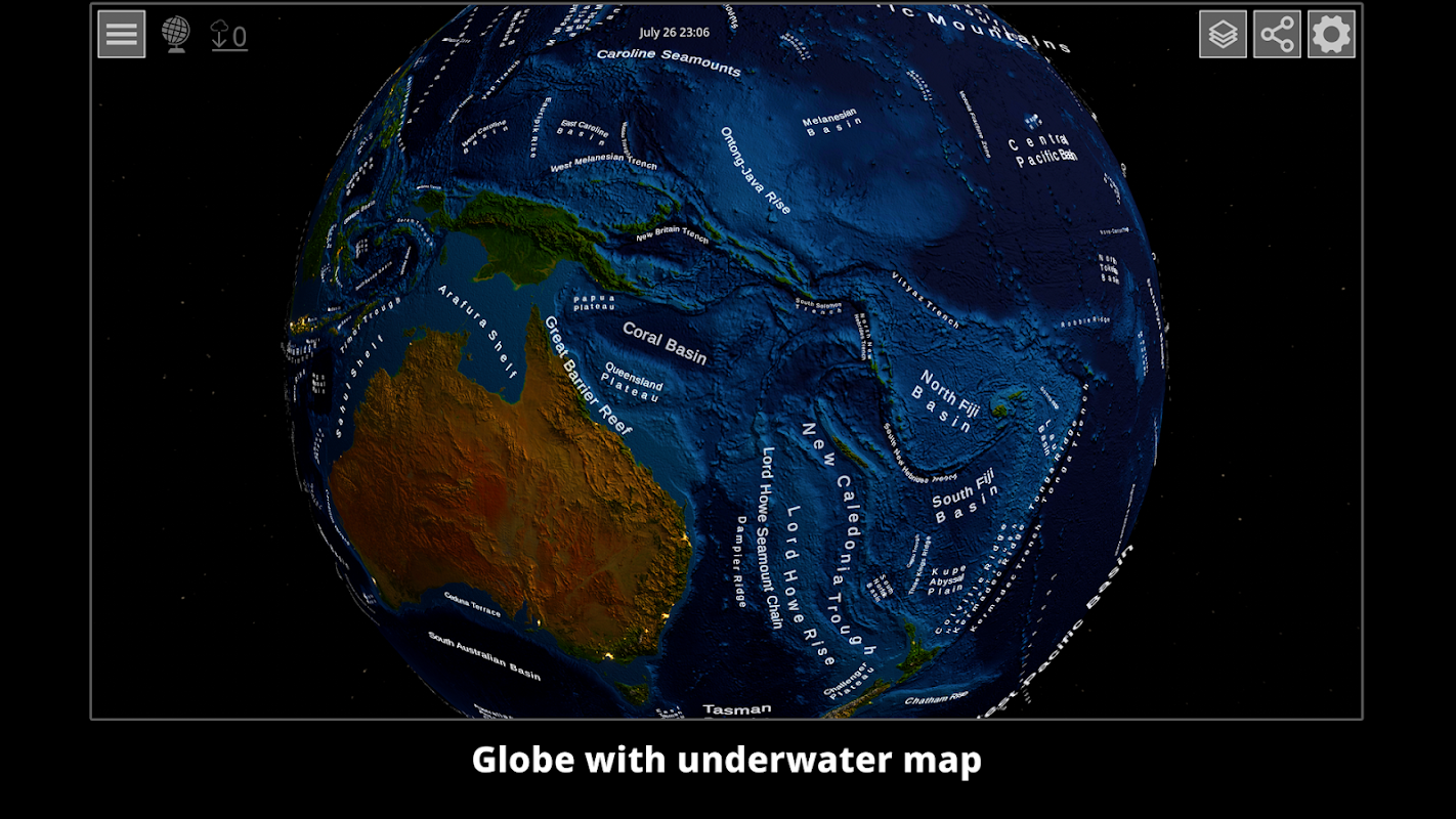 - পৃষ্ঠ, আন্ডারওয়াটার এবং টপোগ্রাফি ম্যাপ সহ ইন্টারেক্টিভ 3D গ্লোব