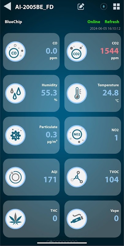 *রিয়েল-টাইম সেন্সর ডেটা: রিয়েল-টাইম পার্টিকুলেট ম্যাটার (PM2.5, PM10), CO, C02, NO2, TVOC, THC, Vape, AQI, তাপমাত্রা এবং আর্দ্রতার ডেটা পান