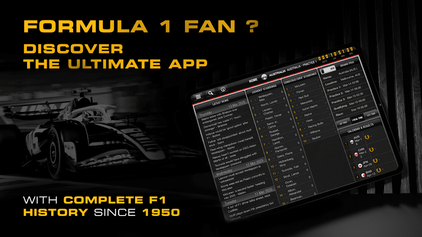 বিজ্ঞপ্তি: এই অ্যাপ্লিকেশনটি অনানুষ্ঠানিক এবং ফর্মুলা 1 কোম্পানির সাথে কোনোভাবেই যুক্ত নয়। F1, ফর্মুলা ওয়ান, ফর্মুলা 1, FIA ফর্মুলা ওয়ান ওয়ার্ল্ড চ্যাম্পিয়নশিপ, গ্র্যান্ড প্রিক্স এবং সম্পর্কিত মার্কগুলি হল ফর্মুলা ওয়ান লাইসেন্সিং B.V এর ট্রেড মার্ক।
