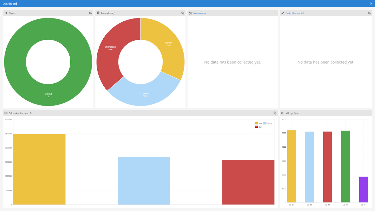 - উইজেট সাম্প্রতিক বস্তুর তথ্য প্রদর্শন করে যা ওয়েব পৃষ্ঠা রিফ্রেশ করার প্রয়োজন ছাড়াই প্রতি দশ সেকেন্ডে আপডেট করা হয়। ডিভাইস নিয়ন্ত্রণ করতে, সাম্প্রতিক ইভেন্ট এবং মাইলেজ গ্রাফ দেখতে কমান্ড পাঠান।