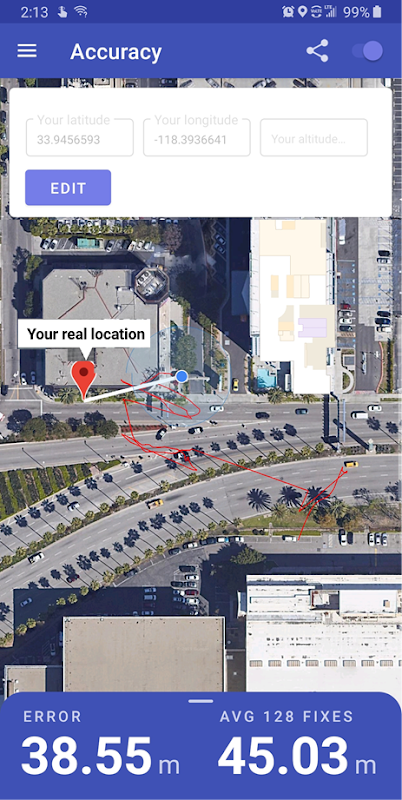 "নির্ভুলতা" বৈশিষ্ট্যটি আপনাকে আপনার * আসল * অবস্থানের (আপনার দ্বারা প্রবেশ করা) বিপরীতে আপনার ডিভাইসের অবস্থানের ত্রুটিটি মাপতে দেয়। অন্যান্য অ্যাপ্লিকেশন আপনাকে * আনুমানিক * নির্ভুলতা প্রদর্শন করে যা আপনার ডিভাইস দ্বারা উত্পন্ন। জিপিস্টেস্ট আপনাকে এই আনুমানিক যথার্থতাকে * আসল * নির্ভুলতার সাথে তুলনা করতে দেয়!