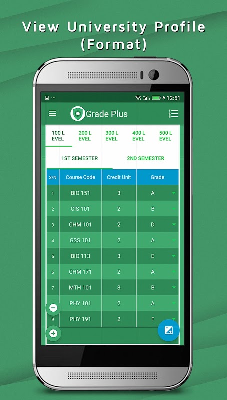 GradePlus সঙ্গে + আপনি ক্রেডিট এবং পদ জুড়ে ছড়িয়ে আপনার কোর্স গ্রেড বিবরণ সংরক্ষণ এবং সুবিধামত আপনার জিপিএ জানা পেতে পারেন - উভয় মেয়াদ ভিত্তিক এবং সামগ্রিক।