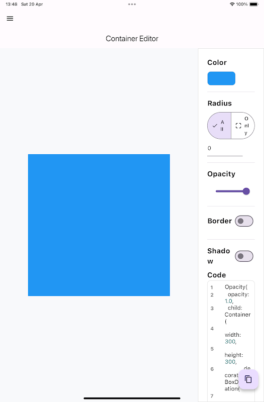 - কোড প্রিভিউ: তাত্ক্ষণিকভাবে আপনার ডিজাইনের জন্য জেনারেট করা ডার্ট কোডের পূর্বরূপ দেখুন এবং অনুলিপি করুন।