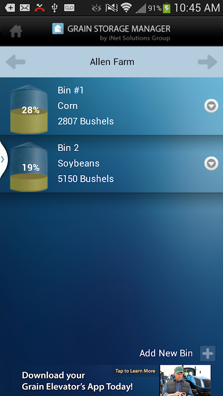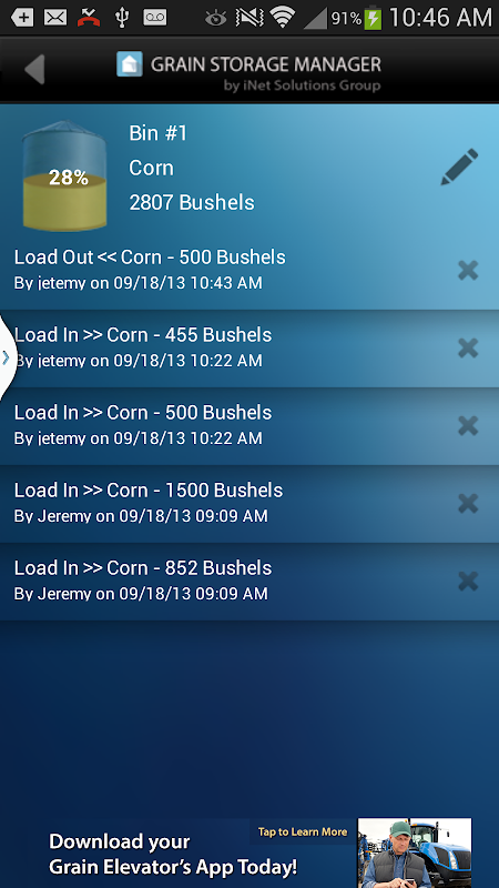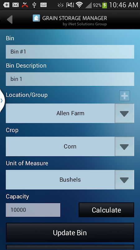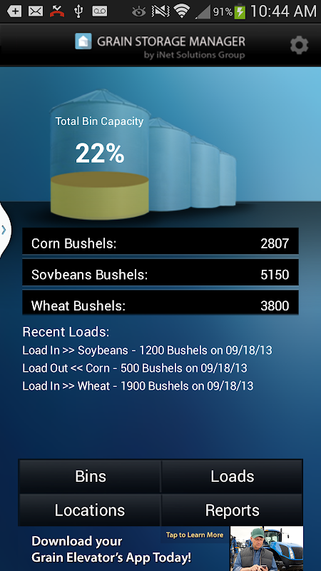 The Grain Storage Manager App (GSM) is a free tool developed for grain farmers that allows them to manage the storage of their crops from the field to the bin and then to delivery or sale. The GSM App lets the user easily create virtual bins, set their capacity, location and crop and then track the crop loaded in or loaded out of that bin throughout the year. The graphical interface shows the current usage (percentage of capacity), total bushels housed and each transaction recorded for loads in and out of the bin.