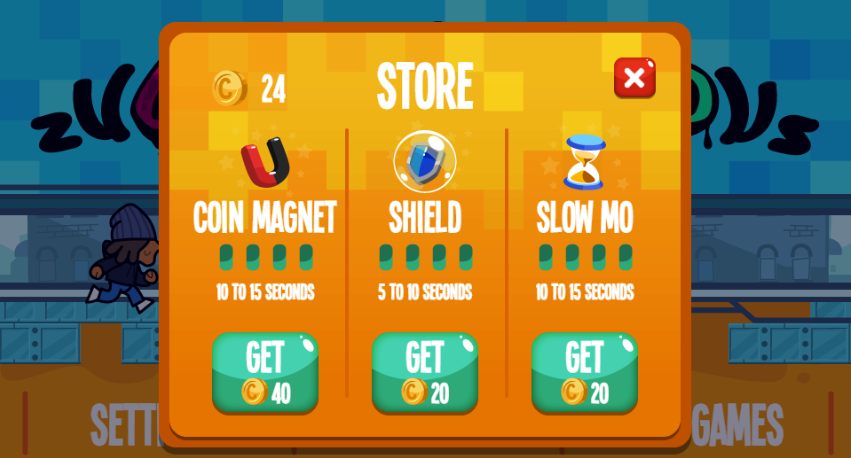 - Collect powerups such as shields, coin magnets, and a slow motion potion