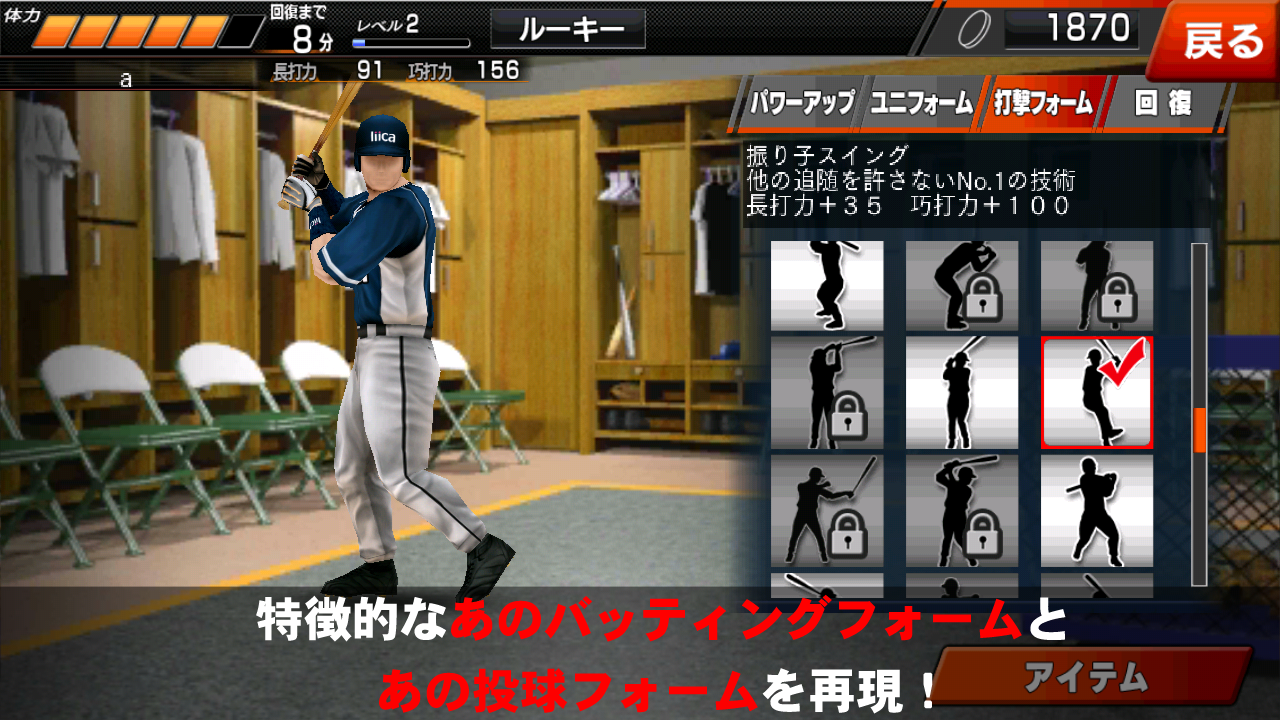 ・アイテムを装備すると長打力(打球の飛距離が伸びる)、巧打力(打ちやすくなる)がアップ!