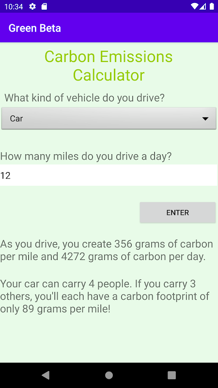 V0.1.3 Features: - The app can tell you how much carbon you will produce on your daily drive - The app has multiple vehicles - The app has limited features but is a working app
