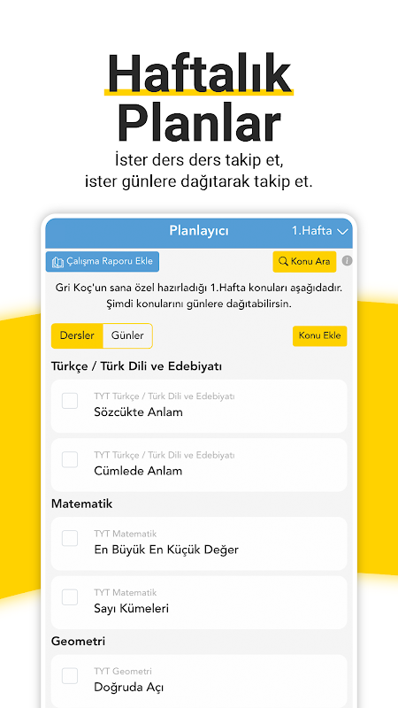বিশেষ করে TYT-AYT স্তরের জন্য Gri Koç দ্বারা প্রকাশিত ভিডিওগুলির সাহায্যে আপনি সহজেই আপনার সাপ্তাহিক প্রোগ্রাম/মাসিক পরিকল্পনাগুলি প্রস্তুত করতে সক্ষম হবেন এবং এইভাবে আপনি আরও অনেক বেশি নিয়মিত অধ্যয়ন করতে পারবেন।