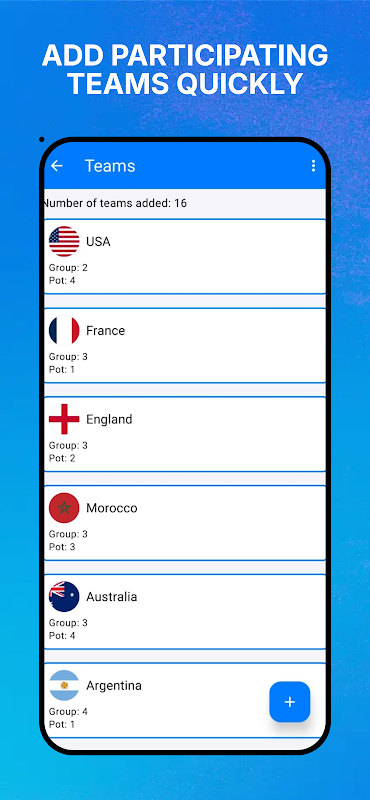আপনার টুর্নামেন্টগুলি শুরু থেকেই সংগঠিত করুন: দল যোগ করুন, একাধিক প্রতিযোগিতা তৈরি করুন, ম্যানুয়ালি বা বাছাই করা পট দ্বারা গ্রুপ সংজ্ঞায়িত করুন, গ্রুপের সংখ্যা, গ্রুপ অনুসারে যোগ্যতা অর্জনকারী গ্রুপ এবং জয়ী, ড্র বা হেরে যাওয়া প্রতি ম্যাচে পয়েন্ট সেট করুন।