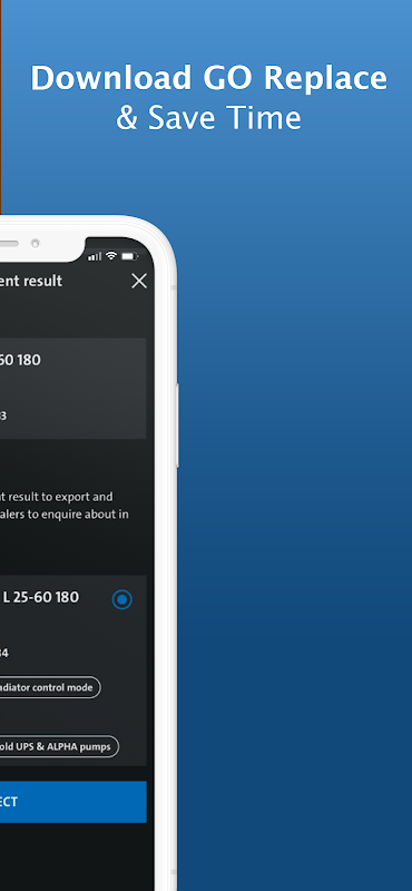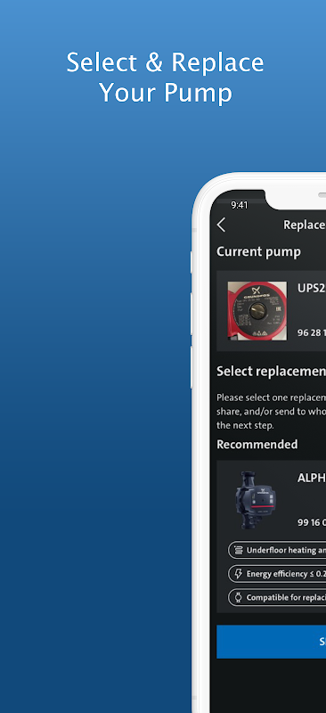 Grundfos GO রিপ্লেস অ্যাপ পেশাদার ইনস্টলারদের শুধুমাত্র কয়েকটি সহজ ধাপে সার্কুলেটর পাম্প প্রতিস্থাপনের জন্য একটি দ্রুত নির্দেশিকা প্রদান করে।