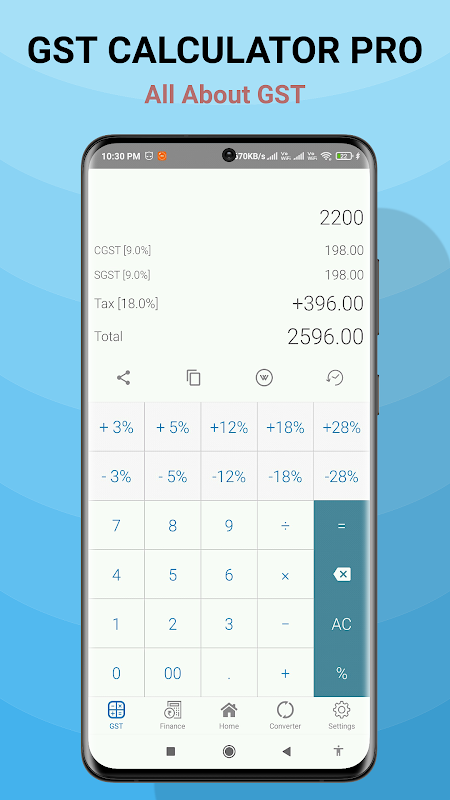 India GST Calculator is a handy app which allows you to calculate all 4 GST tax rates at your finger tips. It takes-in an amount (either gross or net) and allows you to add or reduce GST from given amount.