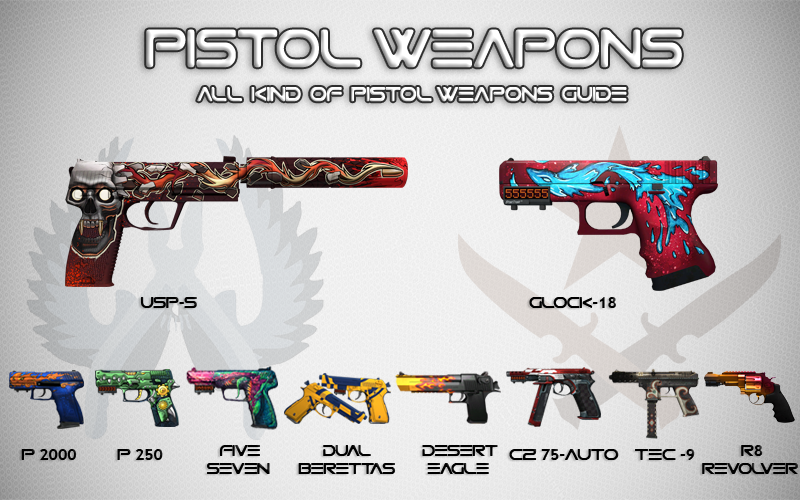 Don't forget about guns. Weapons like M4A1-S, M4A4, AK-47, AWP, Scout, Tec-9, USP-S, Glock-18, Deagle, FAMAS, Galil AR, Nova, Negev, MP7, UMP-45, Bizon, P250, SG can be found here.