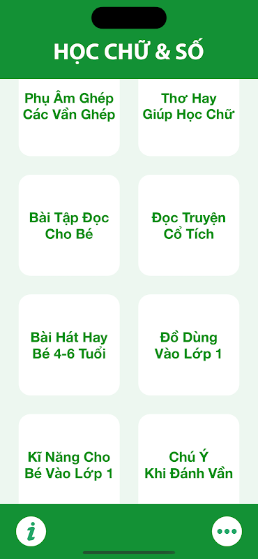 Ứng dụng giúp các con chuẩn bị vào Lớp 1 học chữ cái, chữ số, học đánh vần dễ dàng và hiệu quả. Bên cạnh đó, ứng dụng cũng cung cấp đầy đủ các kĩ năng cần thiết, giúp con tự tin vào Lớp 1.