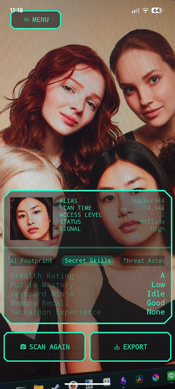 হ্যাকার ভিশন: ক্যামেরা প্র্যাঙ্কের সাহায্যে আপনার ডিভাইসটিকে একটি ভবিষ্যত হ্যাকার ইন্টারফেসে পরিণত করুন! রিয়েল টাইমে মুখগুলি ক্যাপচার করুন, নিয়ন HUD ইফেক্টগুলিকে ওভারলে করুন এবং বন্ধুদের জন্য বা শুধুমাত্র মজা করার জন্য নকল প্রোফাইল তৈরি করুন।