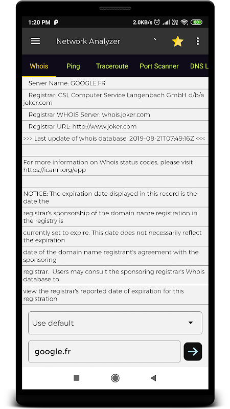 - Ping, LAN Scanner, Port Scanner, DNS Lookup, Whois - Provides information about a website and its owner, Router Setup Page suche netzwerk, Traceroute, Network Analyzer, WiFi Analyzer, IP address with "My ip(endereço de ip)" feature, Connection Log, IP Calculator, ip test & Host Converter, ip utility tools analyser