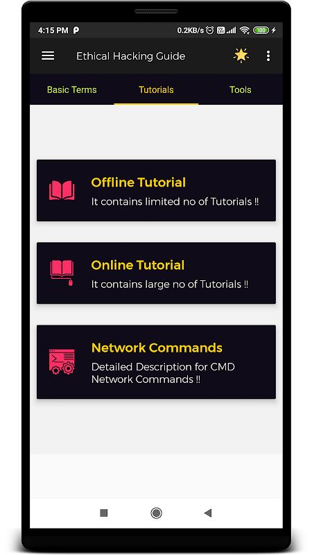 This App provides a huge collection of Ethical Hacking Tools, Tutorials and Computer Shortcut Command Keys and Network Utilities...