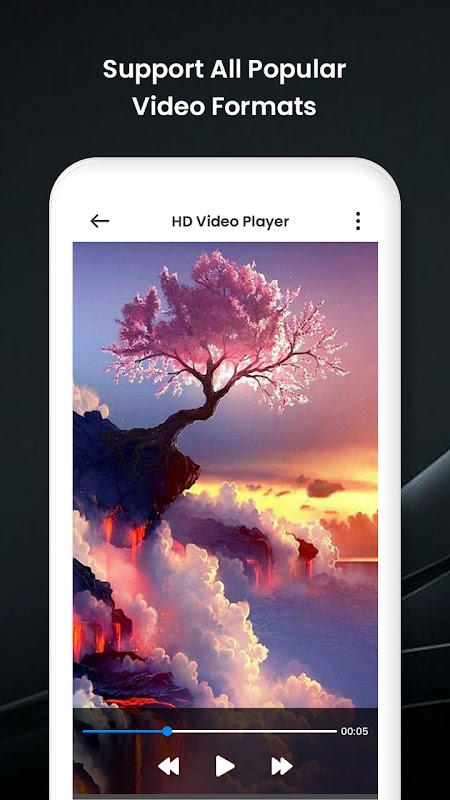 HD Video Player App supports almost all video formats including AVI , MP4 , WMV , RMVB , MKV , 3GP , M4V , MOV , TS , MPG , FLV etc., its depends on your device decoder.
