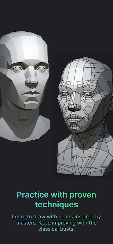 মাস্টার পদ্ধতি দ্বারা অনুপ্রাণিত, হেড মডেল স্টুডিও 25টি ভিন্ন মডেলের সাথে আসে, যার মধ্যে 2টি বিনামূল্যে রয়েছে৷ সাধারণ থেকে আরও বিস্তারিত মডেল পর্যন্ত, মুখের প্লেনগুলি বোঝার মাধ্যমে সহজেই অগ্রগতি করুন। 5টি ক্লাসিক্যাল মডেলের সাথে আপনার অনুশীলন প্রসারিত করুন।