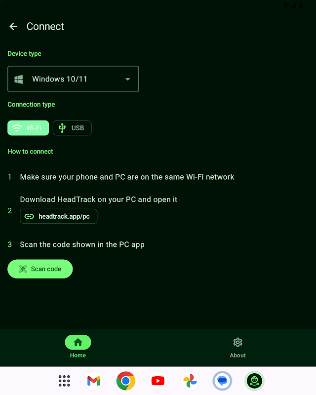 আপনার ফোনে HeadTrack অ্যাপটি ইনপুট হিসাবে Gyroscope বা ক্যামেরা সমর্থন করে। Gyroscope ইনপুটটিতে খুব কম লেটেন্সি রয়েছে যা এটি দ্রুত নড়াচড়ার জন্য ভাল করে তোলে। ক্যামেরা ইনপুট সম্পূর্ণ 6DoF ট্র্যাকিং সমর্থন করে।