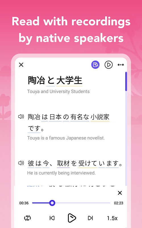 বাস্তব, প্রাকৃতিক জাপানি প্রতিফলিত করার জন্য অভিজ্ঞ নেটিভ লেখকদের দ্বারা তৈরি বিভিন্ন বিষয় জুড়ে আকর্ষক গল্পগুলি উপভোগ করুন।