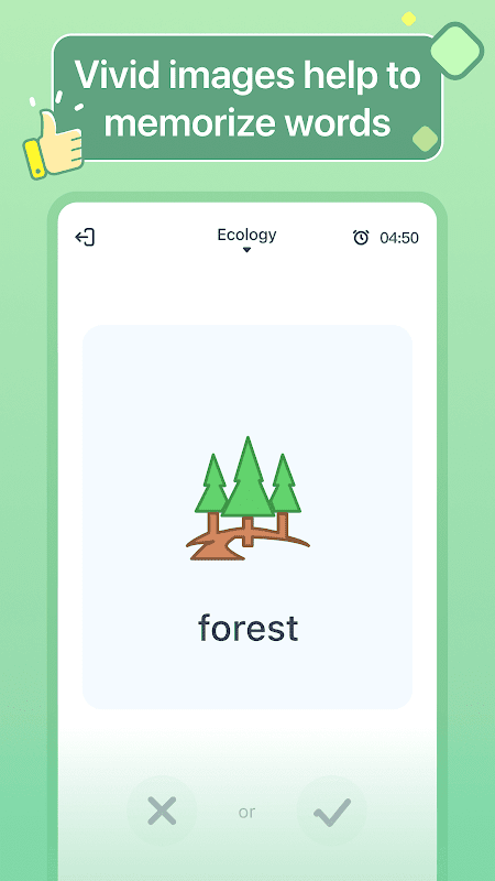 শব্দভান্ডারকে আর কখনও ভুলে না যাওয়ার জন্য, HelloWords Ebbinghaus ভুলে যাওয়া বক্ররেখার উপর ভিত্তি করে "স্পেসড রিপিটিশন সিস্টেম (SRS)" ব্যবহার করে। এটি দেখায় যে পুনরাবৃত্তির গণনাকৃত বিরতিগুলি আপনাকে আরও কার্যকরভাবে শব্দগুলি মুখস্থ করতে দেয়।