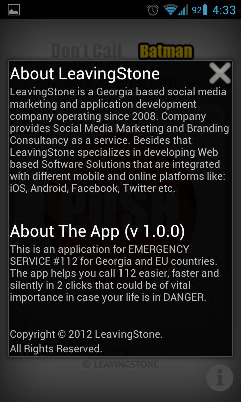 This is an application for EMERGENCY SERVICE #112 for Georgia, EU Countries, United Kingdom, Ireland, Singapore, Hong Kong, Australia and New Zealand. The app helps you call 112 easier, faster and silently in 2 clicks that could be of vital importance in case your life is in DANGER.