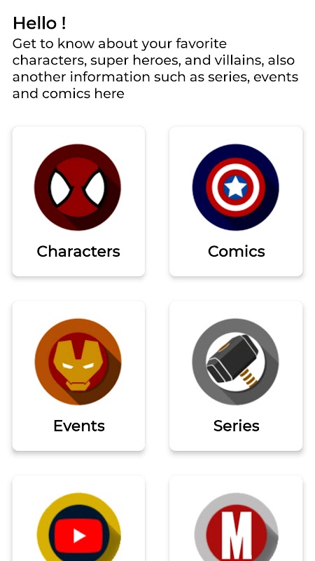 Here you can access information about your favorite characters, super heroes, and villains, also another information such as series, events and comics.