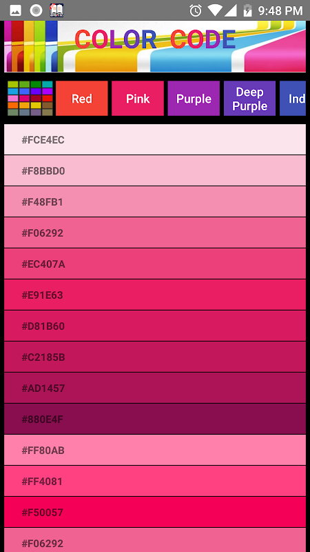 Color code app is very important for developer. There are so many color code in this app. you will get easily hex color code from this app. Hexadecimal color values are also supported in all browsers.