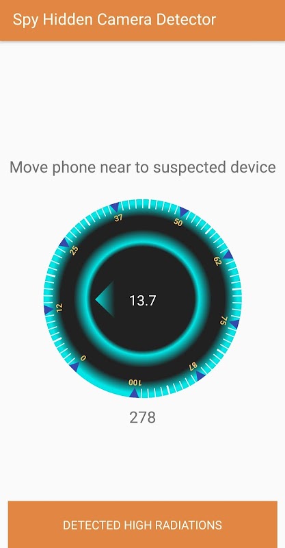 Select any option in hidden camera detector app and move your Android phone near suspected devices such spy camera and microphone. the reading show possibility of camera. Scan bedroom changing room bathroom for Top Hidden camera because there is more possibility of spy camera.