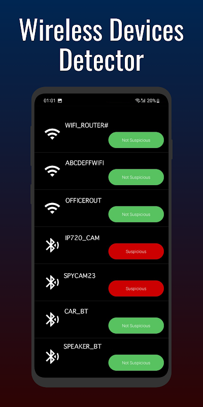 ওয়্যারলেস ডিভাইস ডিটেক্টর বৈশিষ্ট্য সম্ভাব্য সন্দেহজনক ব্লুটুথ এবং কাছাকাছি Wi-Fi ডিভাইসগুলি তাদের সম্প্রচার নামের উপর ভিত্তি করে সনাক্ত করতে সাহায্য করে৷ ফলাফলগুলি দৃশ্যমান ডিভাইসের নাম এবং সংকেত উপস্থিতির উপর নির্ভর করে৷ এই টুলটিকে সমর্থন সহায়তা হিসাবে ব্যবহার করুন - গ্যারান্টি হিসাবে নয় - এবং কিছু অস্বাভাবিক মনে হলে সর্বদা ম্যানুয়ালি যাচাই করুন৷