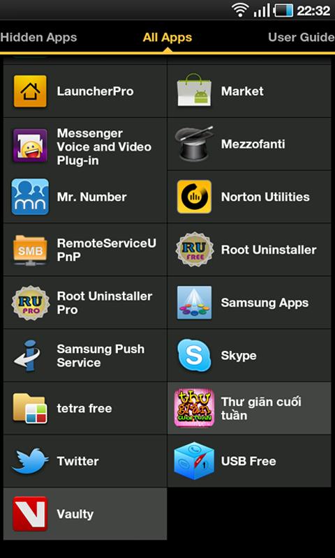 অ্যাপ্লিকেশন অ্যান্ড্রয়েড অপারেটিং সিস্টেম থেকে আপনার Apps (না শুধুমাত্র ড্রয়ারের উপর) আড়াল করতে পারবেন লুকান! আপনি আপনার "টপ সিক্রেট" Apps এর, আপনার ব্যাটারি বা তথ্য ব্যান্ডউইথ (*) খাওয়া যে অ্যাপ্লিকেশন আড়াল করতে সাহায্য করে.