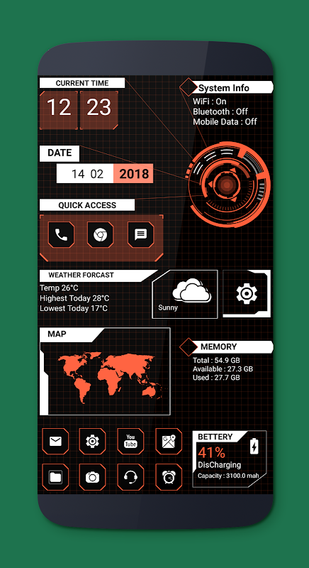 Clock, weather information and battery widget is available in hightech circuit launcher.