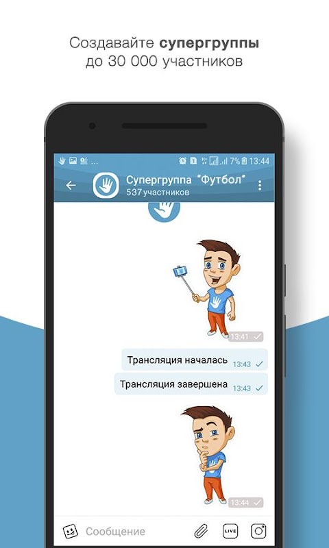 Hola পরিবার, বন্ধু, সহকর্মী সঙ্গে যোগাযোগ করার জন্য ছোট গোষ্ঠী চ্যাটগুলি সক্ষম করে। কিন্তু যে সব নয়! আপনি একটি supergroup 30 000 অংশগ্রহণকারীদের একটি শ্রোতা সঙ্গে তৈরি করতে পারেন! উদাহরণস্বরূপ, যদি আপনি কি একজন ব্লগার বা একজন রাজনীতিবিদ হয় আপনি একটি প্রলুব্ধকর দিগন্ত খুলুন। এবং যদি যে যথেষ্ট ছিল না - পরিষেবার "চ্যানেল" ব্যবহার করুন ...