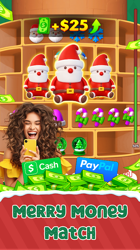 Bells, Santas and Xmas trees sparkle inside a rotating 3D neon shelf. Drag 3 identical items into the bar to trigger a snow-burst blast; clear the shelf before the bar overflows!