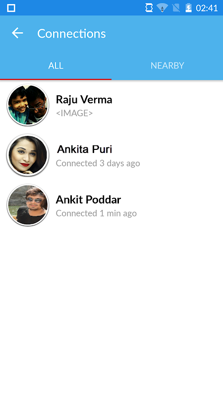 3. Nearby Connections page shows you all the connections which are in and around you. As soon as your connection comes nearby, both of you will get a notification so that you can catch up. The application controls the nearby distance value.