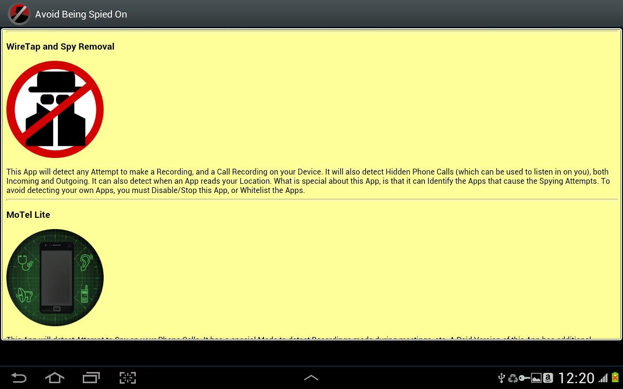 এই অ্যাপ্লিকেশন কিছু ব্যবহার করে, আপনি আপনার ডিভাইস (ফোন বা ট্যাবলেট) উপর সব গুপ্তচর অ্যাপ্লিকেশন সনাক্ত করা, এবং তাদের পরিত্রাণ পেতে পারেন.