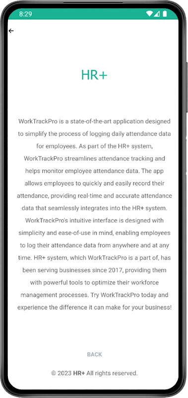 WorkTrackPro হল একটি অ্যাপ্লিকেশন যা কর্মীদের জন্য দৈনিক লগ ইন/আউট করার প্রক্রিয়াকে সহজ করে। HR+ সিস্টেমের অংশ হিসাবে, এটি উপস্থিতি ট্র্যাকিংকে স্ট্রীমলাইন করে এবং কর্মচারীদের উপস্থিতি ডেটা নিরীক্ষণ করতে সহায়তা করে। WorkTrackPro ব্যবহার করে, কর্মীরা দ্রুত এবং সহজেই তাদের উপস্থিতি রেকর্ড করতে পারে, রিয়েল-টাইম এবং সঠিক উপস্থিতি ডেটা প্রদান করে যা নির্বিঘ্নে HR+ সিস্টেমে একত্রিত হয়।