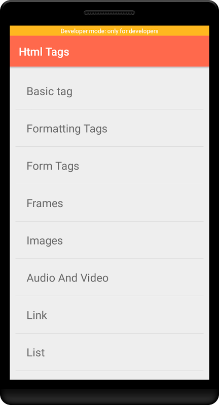 This app will provide description about the HTML tags like Basic tag, Formatting tag, Form tag, Frame tag, Image tag, Link tag, List tag, Table tag, Style tag, Meta tag etc with it's example.