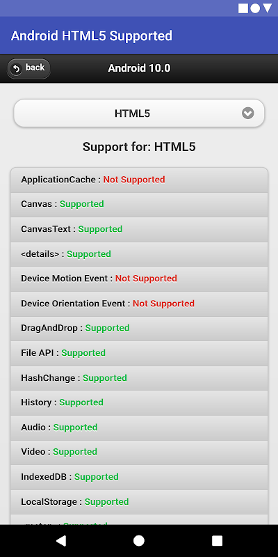 নিম্নলিখিত অ্যান্ড্রয়েড সংস্করণগুলির স্টক ব্রাউজারে এইচটিএমএল 5 এর সমর্থন সনাক্ত করে।