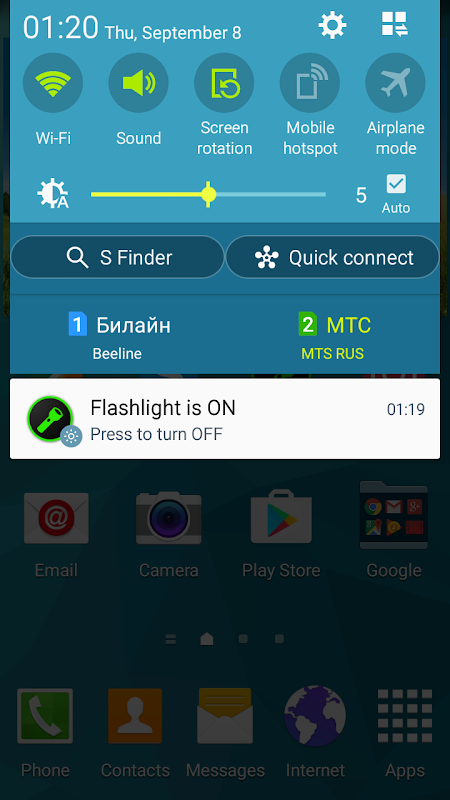 ইন্টারফেস থেকে এই টর্চলাইট শুধুমাত্র একটি আইকন আছে। আপনার জন্য একটি সুবিধাজনক স্থানে লেবেল টর্চলাইট রাখুন। এটি একটি ডেস্কটপ, কুইক লঞ্চ বার, বটম নেভিগেশন বার অথবা নোটিফিকেশন বারে (থার্ড-পার্টি সফটওয়্যারের সাহায্যে) এবং আরো অনেক কিছু হতে পারে ... টর্চলাইট সক্রিয় করতে, শর্টকাট টিপুন। বন্ধ করতে - আবার টিপুন।