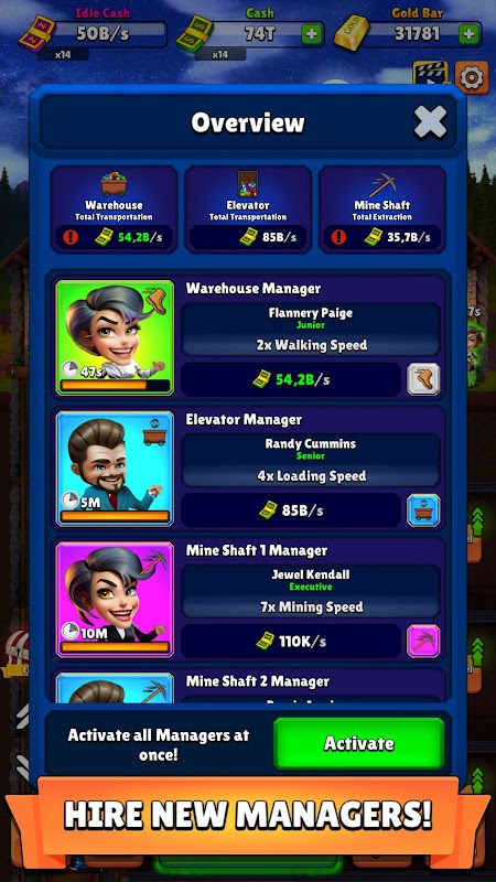 আপনার খনির জন্য অভিজ্ঞ পরিচালকদের নিয়োগ করুন এবং আপনার কর্মপ্রবাহ স্বয়ংক্রিয় করুন! আপনার নগদ এবং নিষ্ক্রিয় নগদ প্রবাহ বন্ধ না হোক! আপনি অফলাইনে থাকাকালীনও আপনার খনি শ্রমিকদের সোনা এবং অন্যান্য আকরিকের জন্য খনন করতে দিন!